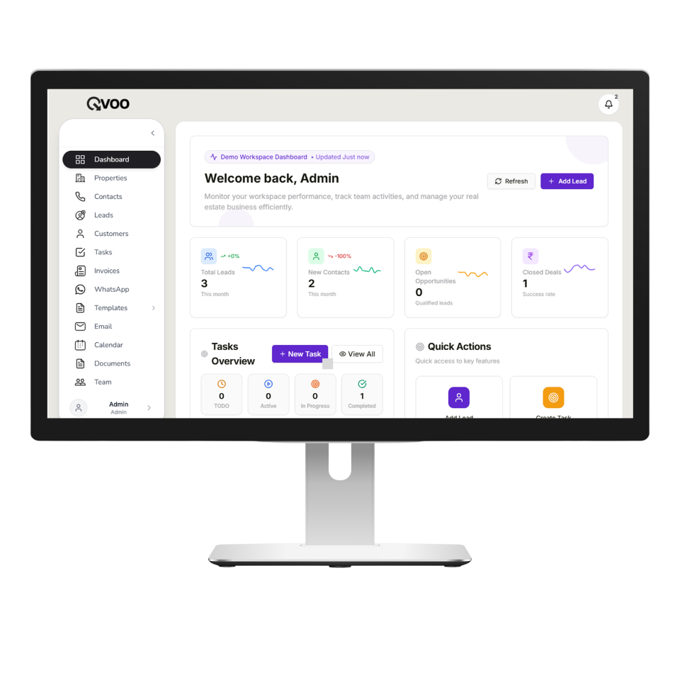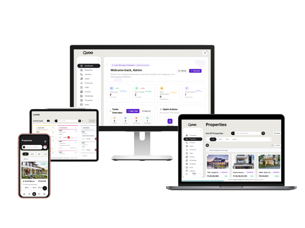 From the first inquiry to final paperwork, our CRM helps you manage leads, properties, and clients with ease. From marketing automation and pre-sales management to sales execution, channel partner collaboration, post-sales support, and data security — Qvoo empowers every stage of your real estate business in one seamless platform.