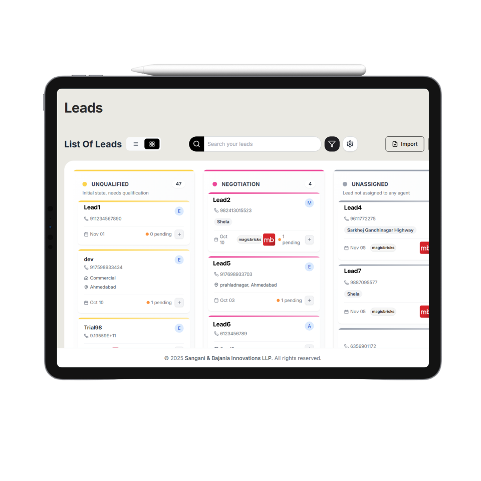 Your next big deal could come from 99acres, a Facebook ad, your website, or a walk-in. But tracking them all is a nightmare of spreadsheets, missed calls, and forgotten follow-ups. You’re losing valuable opportunities in the gaps between your tools, wasting time on manual data entry instead of building relationships and closing sales. Every missed lead is lost revenue, and every moment spent on administrative tasks is a moment not spent with a client. The complexity is costing you more than just time; it’s costing you growth.